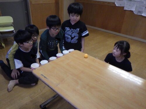 ピンポン玉は1人6球使います!紙コップを狙ってピンポン玉を転がし、何点獲得できるかに挑戦しましたよ!狙いを定めてゆっくり転がしてみたり、勢いをつけて転がしてみたりと工夫しながら行っています。みんな真剣な表情で全集中!転がっていくピンポン玉をじっと見つめていましたね。惜しくも紙コップの手前で軌道が逸れてしまい、カップインとはならず・・・。見守っていた児童たちも「あー!惜しい!」と一緒になって悔しがっていました。それでも諦めず次のチャレンジに向けて気持ちを切り替えます!紙コップにピンポン玉が入ると「おー!100点だよ!」「70点だ!」「やった!!」とみんなで大盛り上がりしていましたよ♬