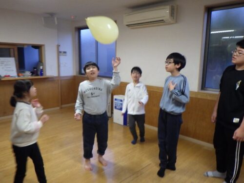 目標が決まったら、さっそくラリーに挑戦です。風船が高く打ちあがると、児童たちはみんな大興奮!「きゃー!」「こっちこっち!」「落ちちゃう!」と声をあげながらラリーを行っています。途中で床に風船が落ちてしまっても、気を取り直して再挑戦☆今度は落ちないように「〇〇くん!」とお友達のお名前を呼ぶなど工夫をしながら取り組む姿が見られました。みんなで協力して見事目標の50回をクリアしています。