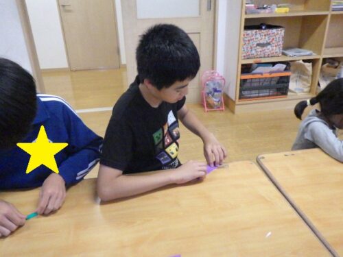 実際に自然界ではニワウルシやカエデの木など、種子に翼の様なものを付けて遠くに飛ばし子孫を繋ごうとする種類があります。そんなお話を職員がすると興味津々で聞いていた児童達でした(^^)まずは職員が見本を折りながら作り方を説明していきます。折り紙の半分を使用するため「もう1個作れるね!」とすぐに気づいている児童もいましたよ。