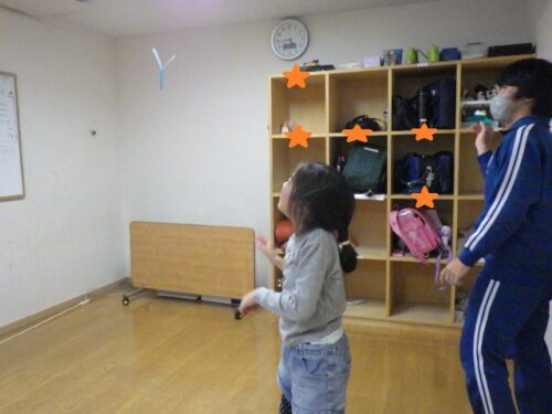 完成後は実際に飛ばしてみます。同じような形になっても少し折り方がずれていたり、折る大きさによって飛び方が全く違いましたね。「うまくいかないよ~」という児童には職員がアドバイスをするだけでなく、上手く飛行している児童から「こことここ折ってみるとうまくいったよ」とヒントが送られていました。普段からそういった助け合いもクローバーの魅力です。上手く飛ばずに苦戦していた児童も他児童のアドバイスを聞きながら挑戦し続け、成功すると「やったー!見て見て!」ととっても嬉しそうでしたね。