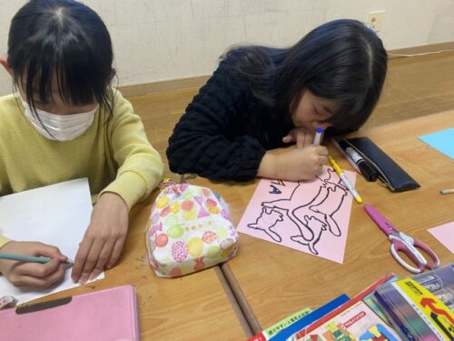 まずはパズルの基本となる模様が描かれた画用紙の反対側に下絵を描いていきます。絵を描くことに関しては自由時間で取り組む児童が多いクローバー(*^^*)特に見本が無くても「どんな絵を描こうかな~」と考えて丁寧に描いていましたね。