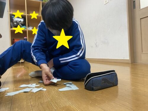 最後は児童同士でパズルを交換して取り組んだり、職員が用意した空き箱を切り分けたパズルに挑戦しました。完成図がイメージができないため、パーツの向きや形、絵をヒントに楽しくパズルに取り組んでいました♪ティッシュ箱パズルは完成すると切り開いたティッシュ箱になるため、模様や色の繋がり、デザインをヒントに完成の絵を想像しながら集中して取り組んでいましたよ!