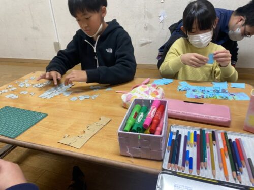 絵が完成すると切り分けてパズルにし、自分で組み立ててみます。職員がもともと用意していた模様はピースが大きくシンプルなものであったため、それを活かしつつ「こことここを切って細かくしてみる」と創意工夫を凝らしながら取り組む児童たち。切り分けた後は自分で完成できるか試してみましたよ。自分で絵を描いたこともあり、全体図が解っているからこそスムーズに完成させる児童もいれば、「あれ!?どんなつなぎ方にしたっけ」と試行錯誤をしながら丁寧に組み立てる児童もいました。