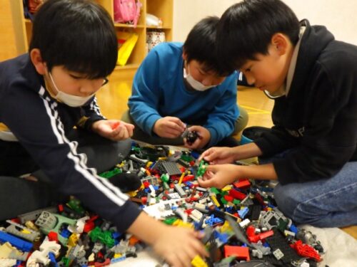 他児童と貸し借りをしながらブロックを使って、同じ世界観で遊んだりと会話がたくさん繰り広げられています!