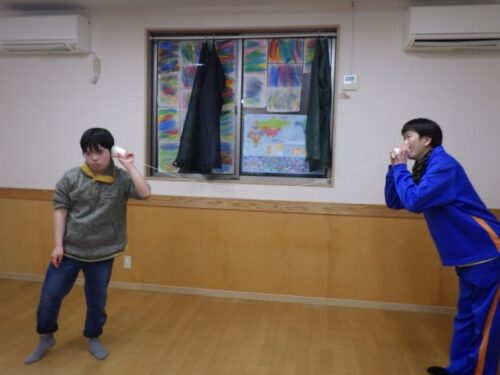 今回紹介する活動は【糸電話で自由研究】です。《音の伝わり方に興味を持つ》《実験を通してコミュニケーションを図る》を目的に、糸電話を作ってどんな風に聞こえるのかを実験しました。