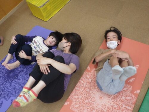 最後は仰向けの体勢で足を抱え、左右に揺れるアヒルのポーズです!自分で出来ない児童はスタッフと一緒にコロコロと転がって楽しそうでしたね☆