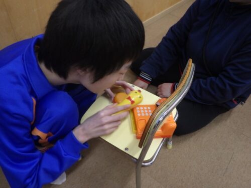 スキャンする前に食べ物をじーっと観察して「どれにしようかな…」と吟味していましたね。食べ物の形や素材によってスキャンを押し当てる感覚の違いに気付いた児童は、色々な物にスキャンを当てて感覚遊びを楽しんでいました。