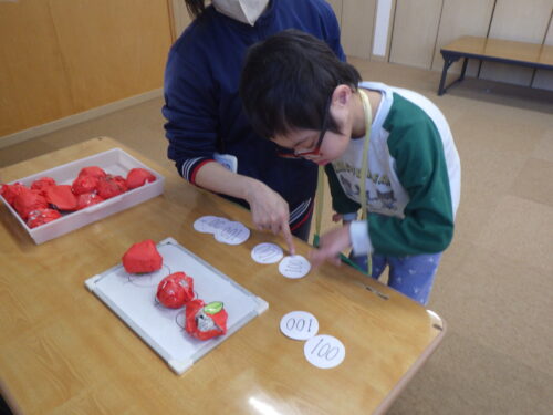 最初のシミレーションでは、職員が2個のりんごの絵を見せながら説明をしました。「2個のりんごを買うためにはお金何枚必要かな?」と職員が聞くと「2!」と答えた児童もおり、周りの職員を驚かせていましたよ!ホワイトボードに書いてあるりんごと同じようにりんごとお金を並べてしっかり確認してからお店の人にお金を渡していた児童たち。指差しで職員と一緒に数を数えながら取り組む様子も見られました。
