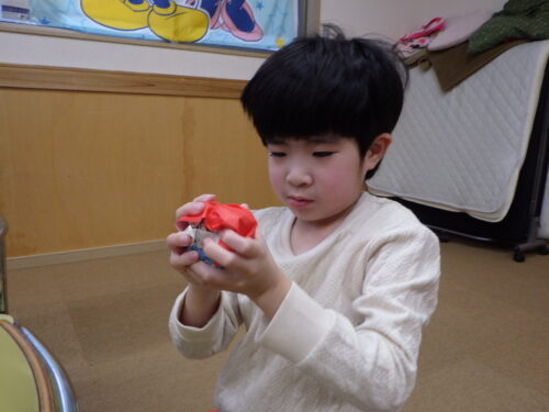 この活動は【握る、離す、丸めるの動作の練習】【社会性を育む】を目的に行ないました。