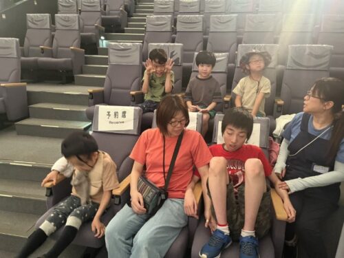 河北町にあるサハトべに花に行きました!日中に外出することが多い児童は、夜空を見ることが少ないため、良い経験になります。サハトべに花までは車で40分で少し長めのドライブでした。いつも送迎車で通っている道と違う道を進んでいたので、児童も少し困惑していましたね。車内では音楽をかけて胸を躍らせていました♪上映中はてんかん発作のある児童も鑑賞するため、てんかん発作が起きても良いように、スタッフ間で情報共有しながら対応しています。