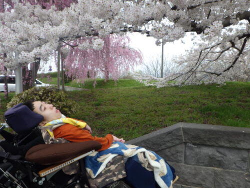 今回紹介する活動は《外出をしよう》です。車椅子で生活をしている児童は経管栄養などで時間に縛られていたり、体温調節も難しいためなかなか日常生活で外出する機会も少なくなってしまいます。療育目的は《四季を感じる》《様々な経験を積む》です。