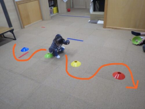 頭に乗せたコーンと、同じ色のコーンをおしり歩きで取りに行くゲームを行いました。