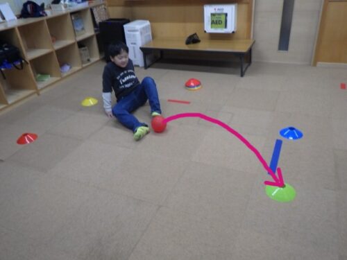 床からお尻が離れないように意識しながら移動し、コーンや風船を使って取り組む活動です!