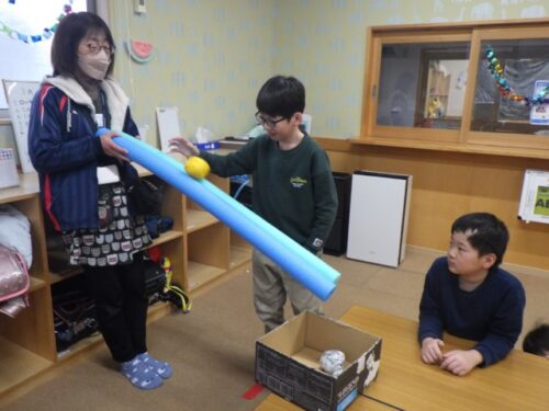 「ここかな?もっと前にしようかな」と箱の位置を定めています。プールスティックの角度も決まると、いよいよボールを転がします。手からボールを離すまで真剣な表情をみせていた児童たち。手を離しボールの行方を見守りながら、箱に入ると嬉しそうによろこんでいましたね♬