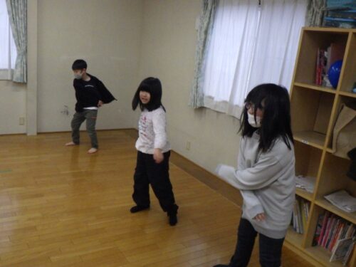 テニスを始める前に、みんなで準備体操をしました。音楽に合わせて自由に大きく身体を動かしていましたね♪準備万端で早速ゲームに挑戦です!