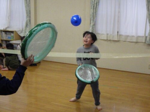 お互いに素早く相手コートに風船を打ち返すラリーが続くと「やばい!面白い!(^^)」ととっても盛り上がりました。