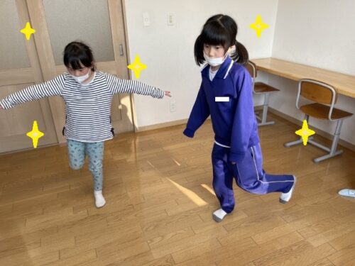 児童たちもはじめは身体をどう動かすか考えながらゆっくりと模倣を行い「手は広げていいのかな」「指はこれであってるのかな」と自分の手足を見て動きを確かめながら模倣を行うことで自分の身体のイメージを確かなものにしていきます。また、身体を動かすのが得意な児童は”先生”としてみんなの前でポーズをとり「それは難しすぎるよ~!」など楽しそうにコミュニケーションをとりながら活動を楽しみました。
