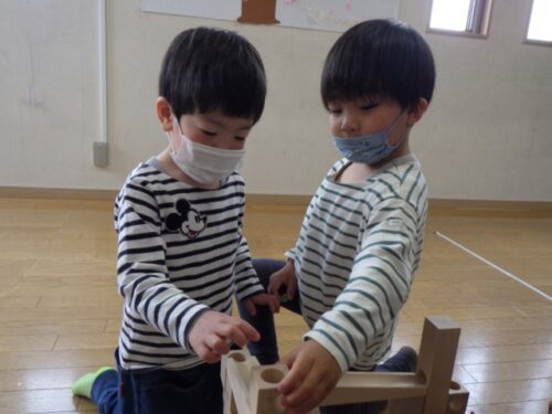 その後も途中で積み木が倒れてしまっても「しょうがない、しょうがない」とまた作り直しています。お友達とのやり取りの中で気持ちの切り替え方も少しずつ学んでいます。
