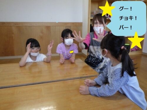 ゲームを始める前に手先の運動です!今回は手先を使ったゲームにチャレンジするため、指先の準備体操をして筋肉の緊張を解いていきます!指折りで数字を数えたり、グー・チョキ・パーの運動やじゃんけんをして、楽しみながら指先の準備体操をしましたね(^^)/指先の筋肉は繊細なので、細かい作業をする前には指先の準備体操をして手指を少し動かしてあげるとその後の動きがスムーズになるためオススメですよ♪