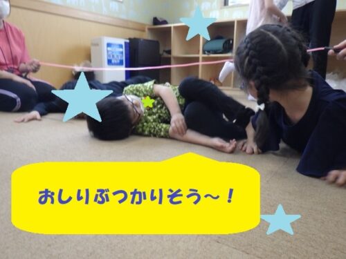 また体を動かすことが得意な児童は縄の下をイモムシのように体をうねうねさせて通り抜けており、大人も真似できないような動きで職員を驚かせていました!(^^)!