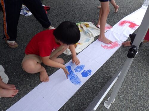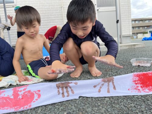 長いさらしの布を広げクラス名の『ヒヤシンス』を全体に描いたり手形や足形を付けて楽しみます。「楽しそう♪僕やりたい♪」「僕はシにしたいです」などと児童達も意慾的で、早くやりたい気持ちが溢れていました☆