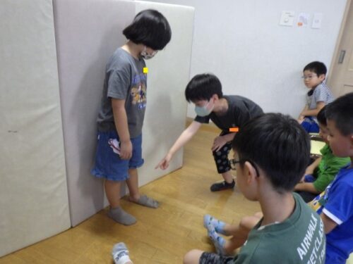 はじめに[〇✖クイズ]を行っています。床に〇と✖をテープで作る際には児童たちが率先して協力しています。〇はテープを短く切ったもので工夫して形を作っていましたね(*^^*)