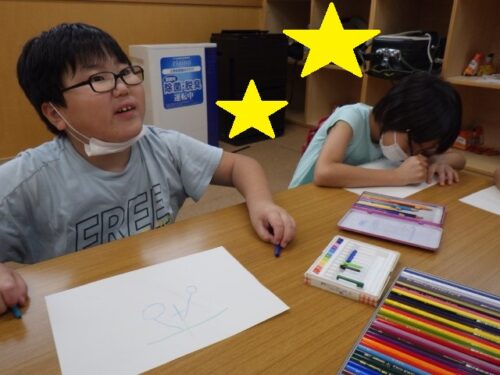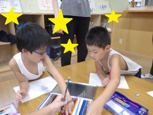 描き始める前に今回の絵を描く時のルールとしてテーマに沿った果物の絵を描く事を再確認しています。好きな果物を描くと決めた児童や家族で果物を食べている所を絵にすると決めた児童と自由な発想で描き始めました。「サクランボって赤くて丸くて…」「スイカの皮には波模様だよね」「イチゴの種は黒!」と果物の特徴を考えながら描いていました。鉛筆で下書きして納得のいくまで描き直したり、大きく紙一杯に果物を描いたりと真剣な表情で取り組んでいました。また、自分の使いたい色を児童同士で伝えあって「〇〇の色貸して」「終わったら貸して」と自然と物の貸し借りもスムーズに行っていましたよ!