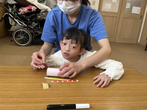 トイレットペーパーの芯にはシールで鯉の鱗を付けていきます!このシール貼りの難しいポイントとしては①「シールを台紙から外す」②「芯に貼り付ける」の2つです。①のはずす作業は特に難しくスタッフが外したり、シールを少し浮かせて外す作業を行いました。得意な児童はどんどん貼り付けを行い、見本通り均一に貼り付けたり重ねてグラデーションのようにするなど児童一人ひとりの個性がでていました(^_-)-☆