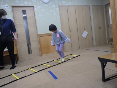 次はグーパーで跳んだり横向きに跳んだりいろいろな跳び方に挑戦しました。グーパーの動きでは足の動きに合わせて「グーパー」と声を出しながら進んでいます♪