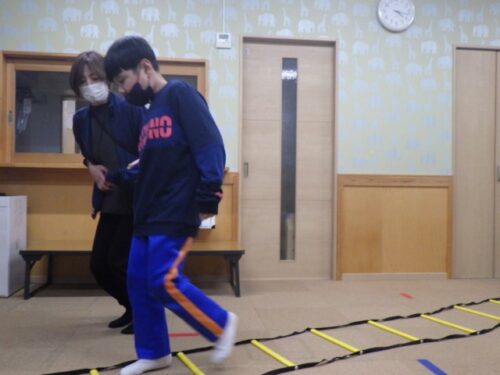 少しづつ黄色いバーの間隔がつかめてくると、ペースを速めたり顔を上げ前を向いて進んでいました♪ジャンプしていると、集中しているあまりだんだんと頭が下がってきて姿勢が前傾してしまう場面もありましたが”頭上げるよ☆背中ピンだよ”と伝えるとハッと気づいて背中を伸ばす様子がありましたね(*^^*)何度も繰り返しジャンプしていると自分で意識して姿勢をまっすぐに保つことができるようになっています☆