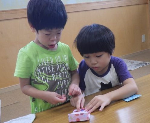 作り方の説明を聞くと、みんな集中してお財布を作り始めます。折り紙を半分に折ったり、テープで留めたりしながら楽しそうにお財布を作っていました。