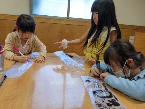 始めに自分のラケットとして使う【傘袋】に好きな絵を描いていきます☆「え~どんな絵にしようか…」少し考えるとると閃いたように絵を描き始め、「形がラケットみたいだからラケットの絵にしたよ」や「私ね、クロミちゃんが好きだから」と好きなキャラクターで可愛らしく絵を描いたりと、どの児童も楽しそうに描いていましたね☆