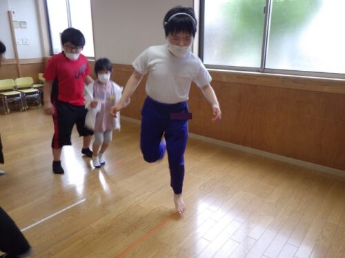 ケンケンパではみんなで声を出しながらリズミカルに進んでいます。前の友達にぶつからないように距離を取ること、またリズムに合わせて飛ぶことを意識して挑戦しましたね!