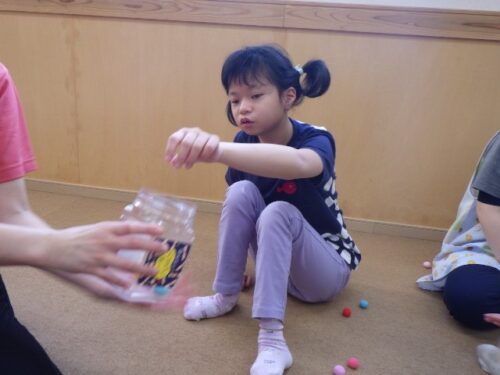 手先の細かい動きを用いるゲームを行い、楽しみながら指先の使い方を学んでいきました。今回の活動では、『力加減を学ぶ』『集中力の向上』『指先の感覚と筋力を鍛える』の3つを療育目的に行いました。