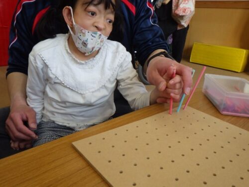 細い棒のペグという物を小さな穴へ入れていくゲームです。指先の器用さだけではなく、穴に入れる際には空間認知の発育も促すことができます。少し難易度の高いゲームとなりましたが、「う~ん」と自信が無いような児童も職員が手を添えながら取り組んでいます!