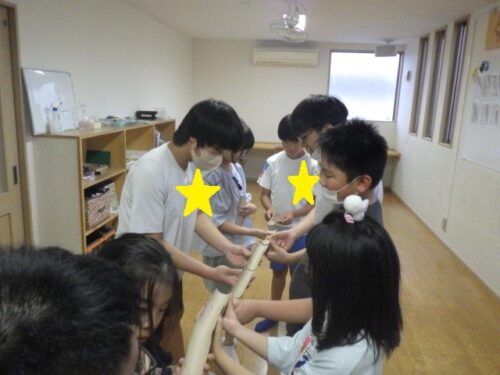 まずは職員と一緒に持ち方を確認します。半円状のトイレットペーパーの芯を1人2つ持ち、隣の児童とつなぐことでコースを作っていきます。「指が入るとひっかかるな~」「強く持つとつぶれちゃう」といろいろな発見がありましたね。練習で何度か挑戦してから本番に入りました!