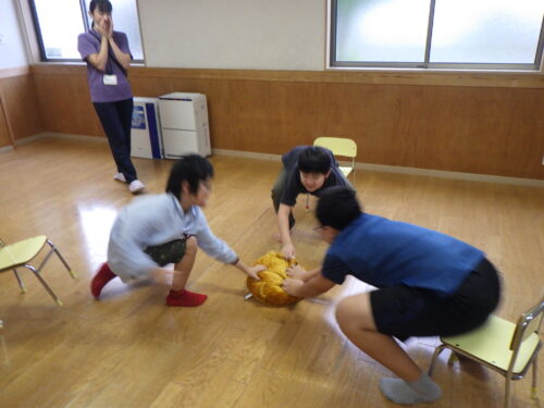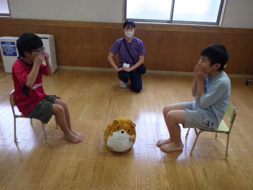 2人で向かい合い、中央にはぬいぐるみを配置します。職員の「あたま」「おへそ」などの指示を聞いてその場所をタッチしていき、「ぬいぐるみ」の指示が出たら中央に置かれたぬいぐるみにタッチ!先に触れた方が勝利となります。