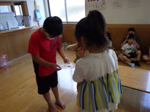 プレゼントを渡す場面では「おめでとう!」の言葉以外に【自分の気持ちを自由に言葉にして伝えてみよう】というミッションがありました。児童たちはそれぞれどんな言葉をかけようか考えて伝えていましたね!自分1人では悩む様子もありましたが、その際には職員と相談しながら相手に何を伝えたいかを考えています。一生懸命考えたため時間がかかった児童もいましたが、そんなお友達のことを優しく待っていた児童たち。自分の気持ちを頑張って伝えた児童と誕生日の児童の両方に大きな拍手が送られていましたよ♬