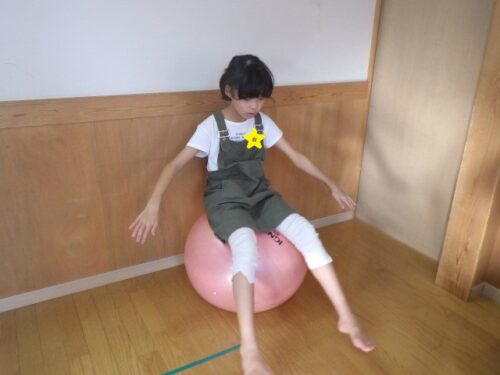 順番待ちの児童はバランスボールに挑戦しています。低学年の児童はバランスボールが大きいため、壁にボールをつけて行ったりスタッフの手を掴んでバランスをとっています♪慣れてくると両手を横に広げて何秒乗れるかチャレンジしたりお腹や背中をボールにつけて乗ったりと様々な方法で遊んでいました!トランポリンの待ち時間も退屈せずに楽しく過ごしていました(*^^*)