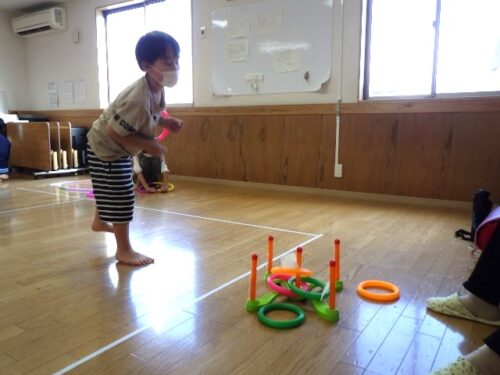 ゲームが始まり真剣な表情で輪っかを投げていきます。「おっしい!入らなかったけどもう1回!」と輪っかを手に持ち次々にチャレンジしていきました!「あ~もうちょっと右に行けば入ったかも」と残念そうにしたり、「入ったよ!!見た?輪っかがね、こう行ってここで落ちたから入ったんだよ♬」と目をキラキラさせて輪っかの軌道を職員や児童に話していましたね(*^^*)