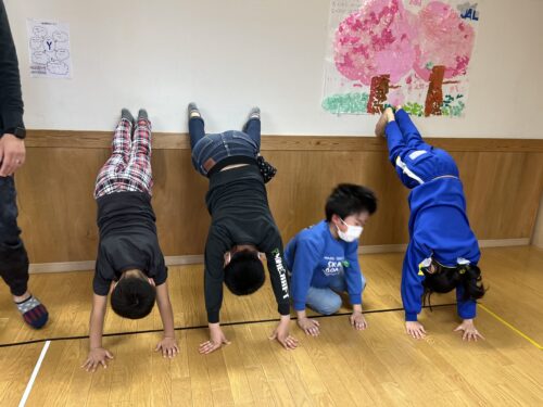 講師の先生の話を聞きながらポーズを真似していく児童達!床に手を着いて、逆立ちのようなポーズに挑戦しています。「え~!出来たけどきつい!」と話しながらもしっかりバランスを保っていましたね!次は、その状態から手を前に動かして進んでいきます。さっきよりもきつい体勢になり「うぁ~!!」と食いしばりながら講師の先生の「はい、休む!」のかけ声まで頑張って踏ん張っていましたよ!