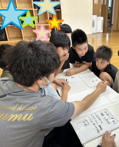 その後は「どんなことをすると危ないかな?」という職員の問いかけに、「走らない」「体を叩かない」など肝試しを楽しく行うにあたってのルールを出し合って「そうだね、そうしよう!」と全員が理解して取り組めるように話し合いました!