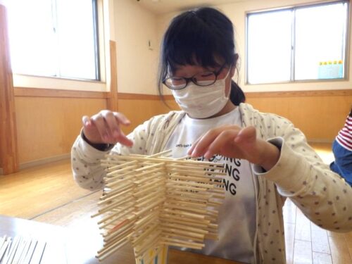 次々に割りばしを積み重ねていき、どんどん高くなるわりばしタワーに嬉しそうな児童たち♪積み重ねる時にも「あっ!斜めになってる!?直さないと!!」「これ大丈夫かな?どうかな?」と他児と協力をしたり、全体のバランスに注意をしながら倒さないように慎重に進めていましたね☆指先に力を入れつつも、割りばしを重ねる時には優しくそっと置き、集中力を高めながら記録を目指して取り組んでいた児童たちです。
