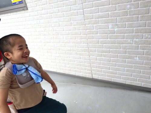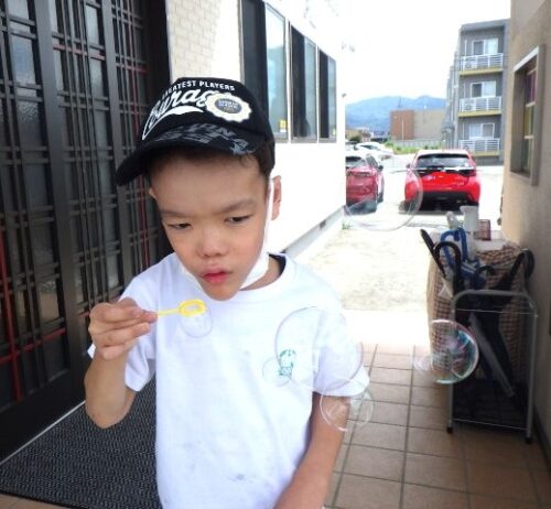 シャボン玉を吹くことが呼吸筋力の訓練にもなります。呼吸している時よりもストローのような吹き具を使うことによって、長く吹くことができ、シャボン玉を吹いているだけで呼吸筋力増強効果が期待できます。シャボン玉を吹く事で楽しみながら呼吸に意識を向けることができるため効果的です。実際にはシャボン玉を吹いている児童に「大きいシャボン玉をつくるためにフーっと優しく吹いてみよう」と声掛けを行いました!始めはシャボン玉を強く吹いていましたが、練習を重ねる内に大きなシャボン玉ができると嬉しそうに指を指して教えてくれました!(^^)!