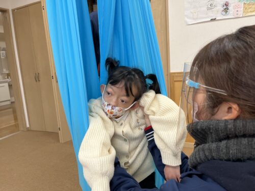登所すると天井からぶら下げられたスリングの布を見て、すぐに「乗りたい!」とアピールする児童もいましたよ!